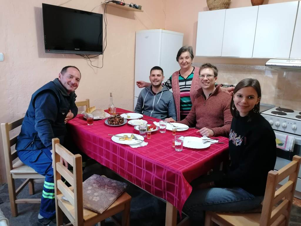 Aux alentours de midi, nous commençâmes à avoir grand faim, comme vous pouvez vous l’imaginâtes. Organisés comme tout, nous avions prévu burek et autres pizzas achetés à la « pekara » (la boulangerie) pas loin de chez moi avant de partir, en vue d’un probable pique-nique. Mais, en nous baladant, nous avons remarqué un petit panneau mentionnant une guest-house, qui, bien qu’elle semblât fermée, nous a inspiré un petit arrêt en quête peut-être d’un café chaud. Et ça n’a pas loupé, l’hospitalité serbe nous a pris par défaut, et nous voici en 5 minutes tous les quatre installés au chaud à la table de Deki dans la guest-house de la famille Vidanović. Notre hôte partage avec nous le repas originellement prévu pour lui et sa famille. Heureusement, quand les Serbes cuisinent, ils (enfin, elles) ne sont pas pingres en quantité : quand il y en a pour trois, et bien, apparemment il y en a pour sept aussi. Salades, viandes, rakija, vin fait maison, le fameux « kominjak« , deuxième bouteille de vin fait maison, dessert et café, tout y passe, le tout au gré de nombreuses conversations intéressantes sur des sujets aussi variés que la religion, la région de Pirot, la vie politique en Serbie, l’économie du tourisme en temps de Covid, et j’en passe. Un repas bien rempli donc que ce soit en terme de discussions ou en terme de nourriture. Nous ne ressortons de la guest-house qu’à la nuit tombée, mais ravis de ce moment passé en bonne compagnie.
