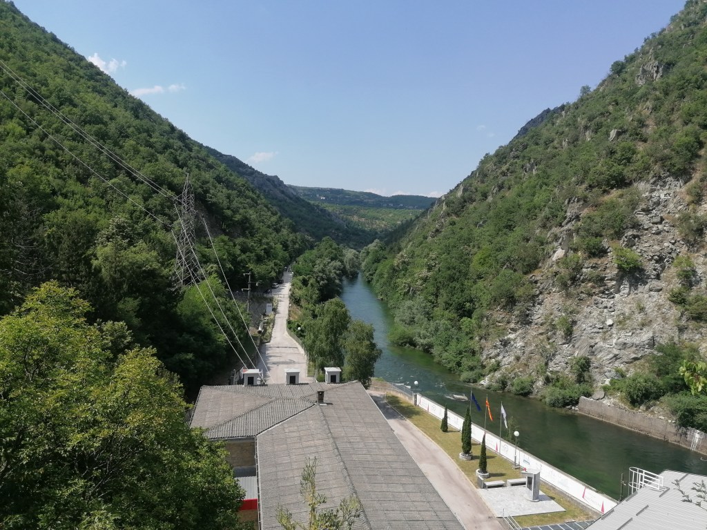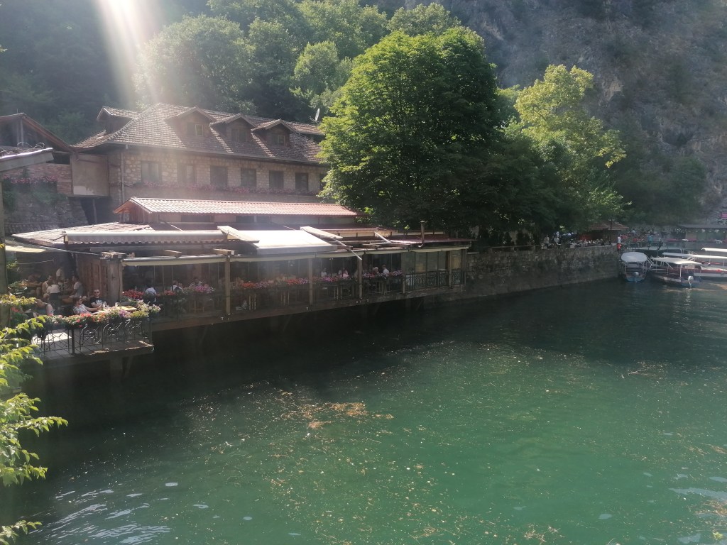 Très souvent, sur les blogs de voyage, on a pu lire parmi les 10 choses à faire à Skopje, des excursions en dehors de Skopje. C’était un peu étrange dans les listes de bloggeurs de trouver « Que faire à Skopje ?! Un daytrip à Pristina » ou « 10 tops in Skopje, Ohrid Lake » comme si ce n’était pas complètement un autre pays ou qu’il n’y avait pas dix choses à faire à Skopje même (après j’avoue que ces deux excursions auraient été intéressantes et je me garde la possibilité de faire ça la prochaine fois). En réalité le dimanche tout est fermé à Skopje et comme il faisait environ 1000 degrés, on avait une bonne excuse pour sortir de la ville. On a choisi d’aller prendre l’air dans le canyon de Metka a proximité de la ville : 30 minutes de route et des paysages verdoyants garantis ! Assurez vous d’avoir un bon conducteur dans votre équipe parce que le parking est un peu sportif (bravo à mon pilote) mais à part ça c’est plutôt bien organisé. Vous pourrez pique-niquer sur place ou manger dans un des restos le long de la rivière/lac, faire du bateau si le cœur vous en dit ou tout simplement laisser vos pieds faire trempette en admirant les Skopiotes un peu fous qui sautent depuis un pont alors que le lac fait environ 30cm de profondeur (bon ok j’exagère un peu mais quand même). En gros, que du fun.