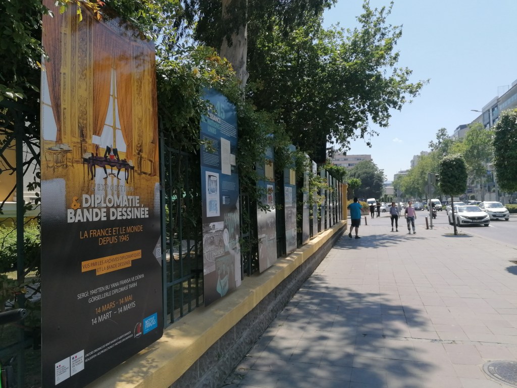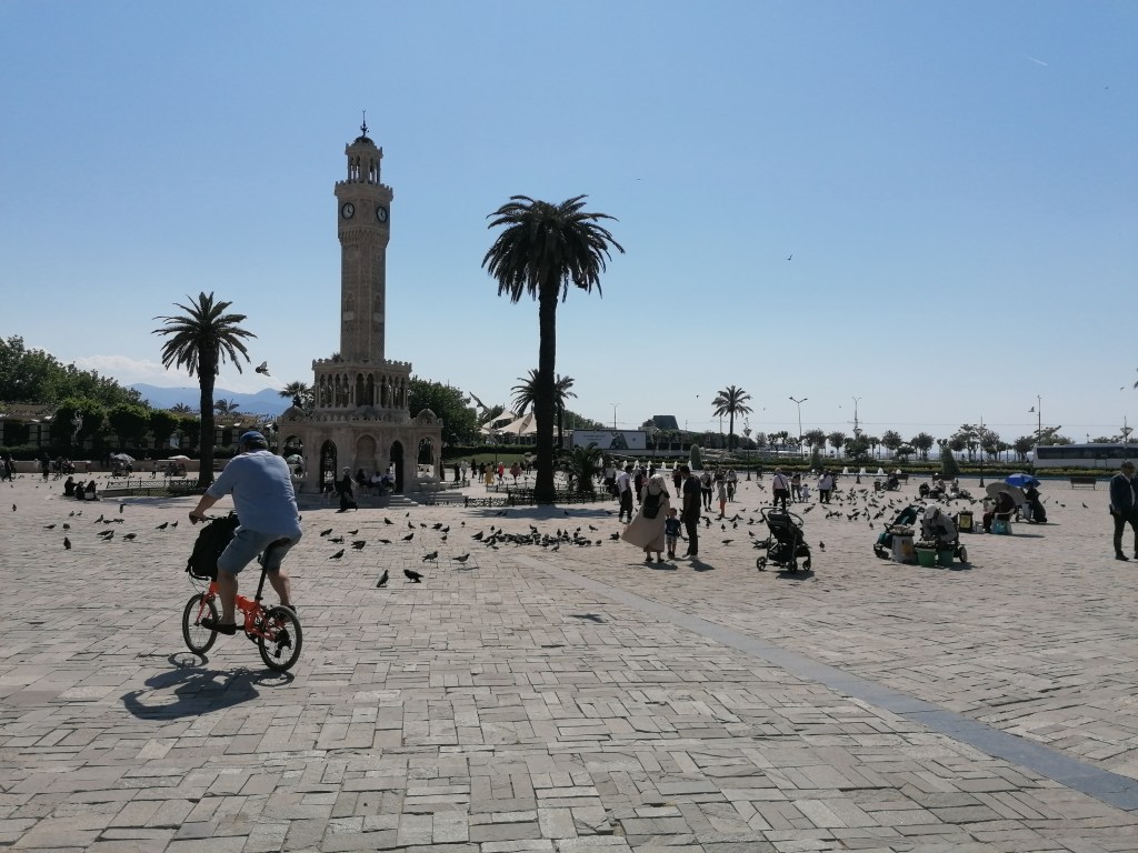 La balade le long de la mer est super agréable, et, au gré des arrêts intempestifs, on tombe sur l’endroit le plus cool de la ville (et oui, rien que ça !) j’ai nommé… L’Institut français d’Izmir évidemment (comment ça je suis pas du tout objective ?) ! On s’attarde un peu devant une exposition sur les bandes dessinées et la géopolitique qui nous donne envie de lire plein de livres et même de nous inscrire à la charmante médiathèque (c’est vous dire !). On continue ensuite notre chemin jusqu’à la place de l’horloge, où il y a, ben… Une horloge… Et beaucoup de gens. C’est la place centrale d’Izmir située dans le quartier tout aussi central de Konak. Sachez que la tour de l’horloge, symbole de la ville, a été dessinée par un architecte français, je dirais même landais, qui était venu donner des cours de FLE. Le monde est petit.