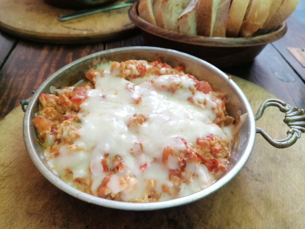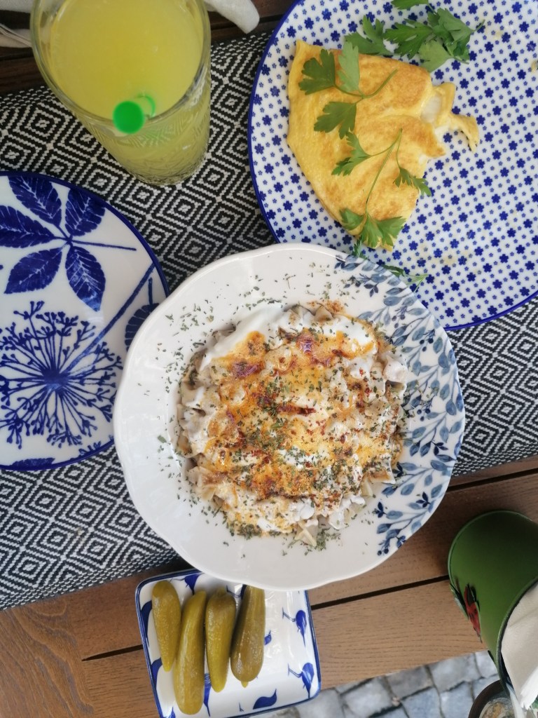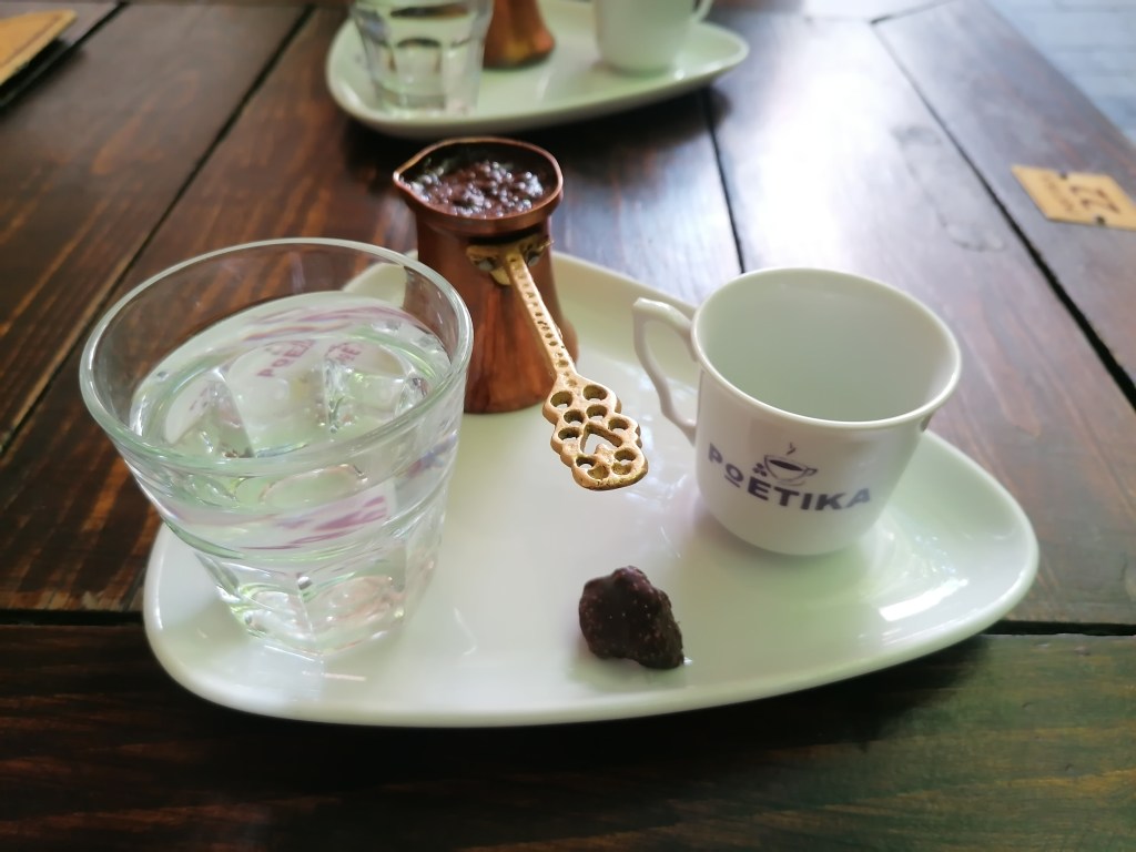 Pour ce premier jour on décide de partir sans but précis afin de prendre la température de la ville. D’ailleurs, en parlant de température, on est au mois de mai et il fait déjà 30 degrés : heureusement, le vent du bord de mer vient nous rafraîchir les mollets mais je me dis que, quand même, les gens doivent avoir bien chaud en été ! Notre première et plus importante étape, bien sûr, c’est manger. Ça tombe bien car il y a plein de resto littéralement au pied de l’hôtel. On choisit le Poetika Kafe où on commande un café turc et un « menemen« , sorte d’omelette du petit déjeuner, pour bien commencer la journée. Jusqu’à présent (et ça se confirmera au fil des vacances) les gens ne parlent pas trop anglais mais ils sont tellement gentils que ça n’a pas d’importance. Un peu d’azerbaidjanais bredouillant par-ci, quelques mots anglais par-là, des sourires et hop, on se comprend tous.