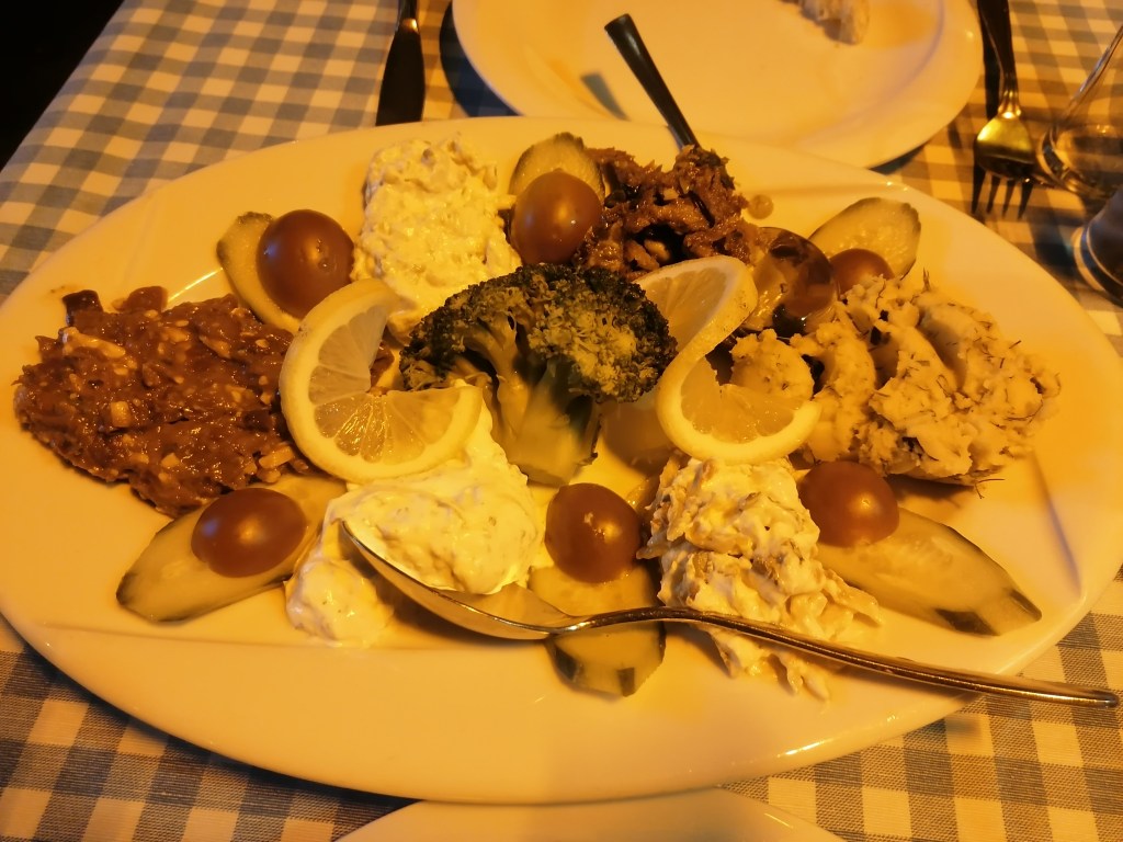 Après toutes ces aventures on a bien mérité un bon repas d’amoureux, et encore une fois ça tombe bien, il y a un super resto à 20 secondes de notre hôtel, le Beyaz Konak. Au menu ce soir : mezzes au choix (qu’ils ont choisi eux mêmes car nous on était trop fatigués pour prendre des décisions), poissons et vin blanc ! Miam. C’est pas le resto le moins cher mais c’était trop bon et le décor est quand même assez cool : on valide.