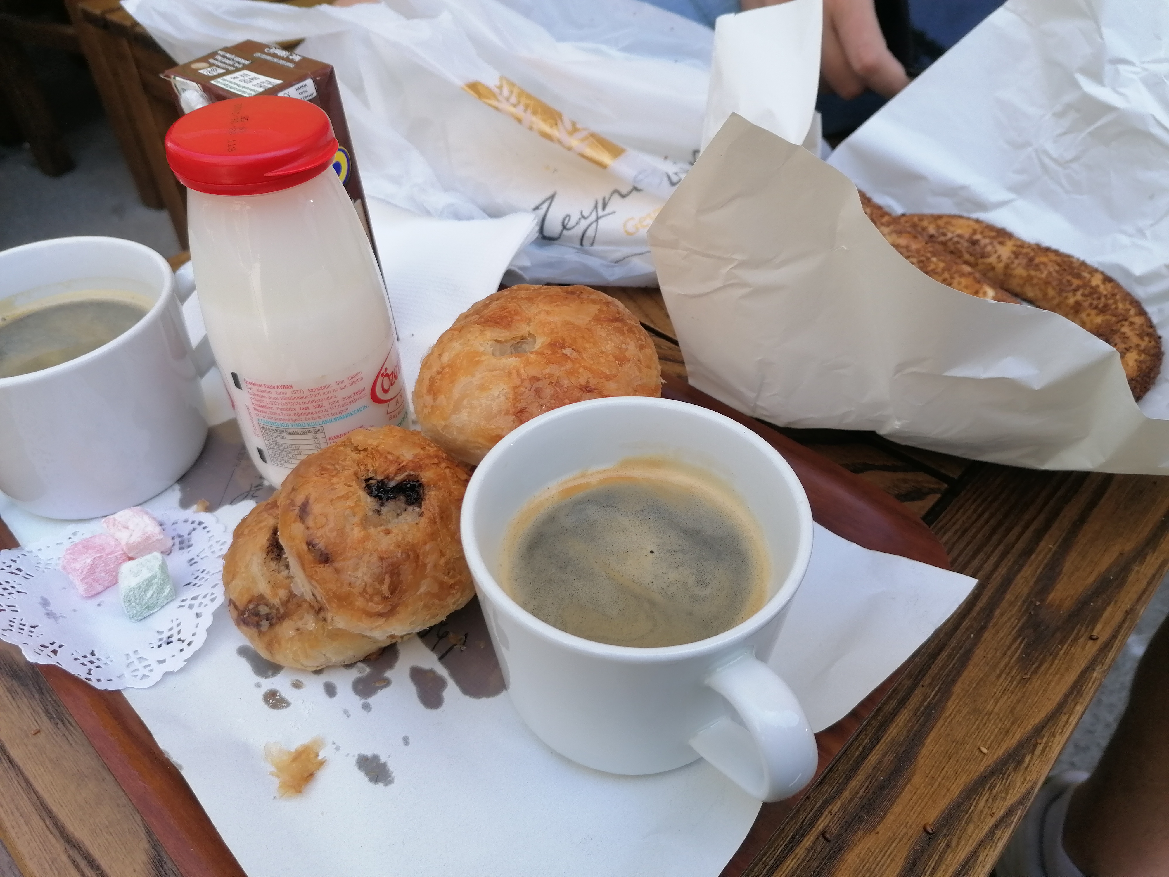 Pour notre dernière journée complète à Izmir, on se prend désormais pour de vrais locaux. Pour notre petit déj on va manger des « gevrek » du Zeynel Ergin Gevrek Fırını et des « boyoz » du Alsancak Dostlar Fırını, suivant la recommandation de Ozan, un ancien volontaire du Corps Européen de Solidarité qui vient d’Izmir et dont j’avais fait la connaissance virtuelle grâce au projet #ENV4env. Ce sont deux supers adresses, en plein centre-ville, fréquentées par les locaux comme par les touristes, c’est pas cher et en plus très bon. On est un peu gourmands et on commande trop pour nos estomacs, ce qui ne nous empêche pas de tout terminer.
