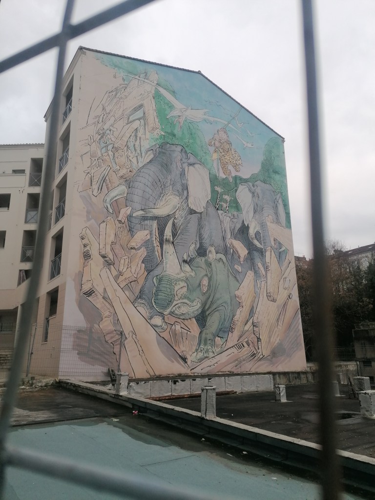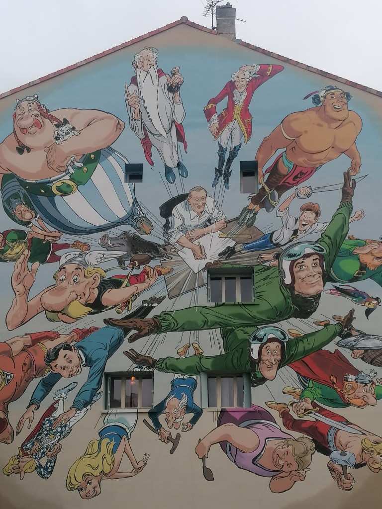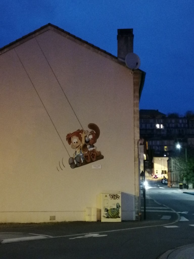 Angoulême, véritable « ville du son et de l’image », fête la bande dessinée un peu toute l’année. Plusieurs indices vous le prouveront tout au long de votre visite. Déjà, les noms de rue sont tous indiqués par des bulles de bande dessinées : clin d’œil très mignon au 9ème art à chaque coin de la ville. Ensuite, beaucoup de restaurants, de cafés, de magasin portent dans leurs noms ou dans leurs produits des références à la bande dessinée. Surtout, ce qui frappe le passant, ce sont les nombreux murs peints qui décorent le centre ville. Ma chère cousine m’a emmenée les découvrir à l’occasion d’un tour des murs peints, une balade qui prend un certain temps si vous avez envie de tous les voir. Je vous en partage quelques uns de mes favoris 🙂
