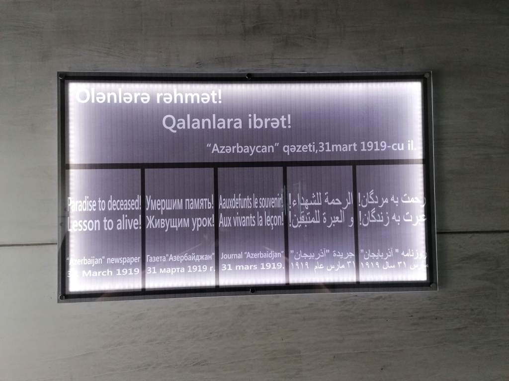 It was probably during my first trip outside of Baku that I went to discover the Guba Genocide Memorial complex (I know, I know, just by its name you can expect the very depressing, nonetheless important topic of the place). Located near the city of Guba in the north of Azerbaijan, this museum is built under the ground on the place where a mass grave of Azerbaijani victims was discovered in 2007. It tells the story of 1918 so-called genocide of Azerbaijanis by Armenians in the context of ethnic conflicts during Bolshevik revolution. The museography is well done with an interesting immersion into these events through photos and testimony, and, reading how the history is told, you will understand that reconciliation is (sadly) probably not going to happen anytime soon.