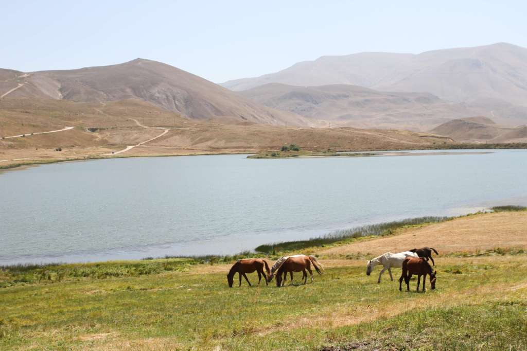Cette fois, on décide de se rendre vers le Nord du Nakhitchevan pour aller admirer le lac Batabat, situé juste de l’autre côté de la montagne séparant l’Azerbaïdjan de l’Arménie. Notre chauffeur nous indique une source d’eau très fraîche, réputée dans la région. Plusieurs touristes locaux sont également sur place mais aucun ne reste bien longtemps, et encore moins pour faire le tour du lac, idée qui semble somme toute saugrenue pour un esprit azerbaïdjanais. On assume notre statut de touriste étranger et on entreprend un grand tour du site (que faire d’autre ?) et, à notre retour, un monsieur nous offre gentiment un moment d’hospitalité : thé, noix et miel de sa propre production. C’est une pause bucolique (et savoureuse) que tout le monde apprécie. D’ailleurs on repart tous avec notre pot de miel du Nakhitchevan 🙂