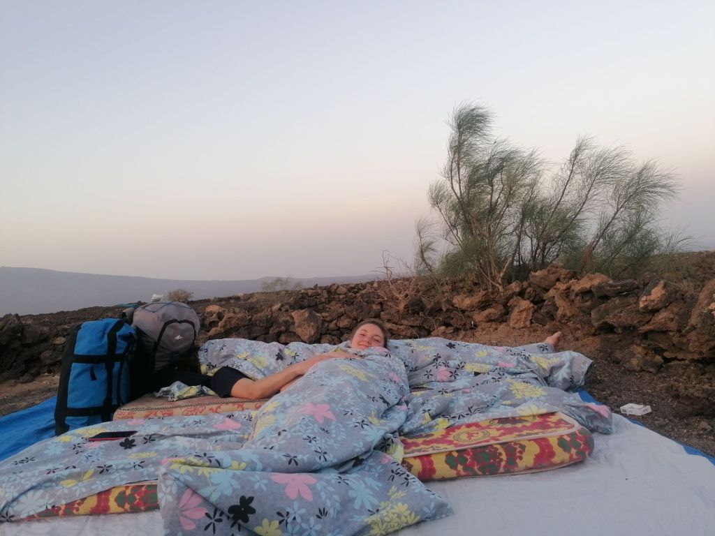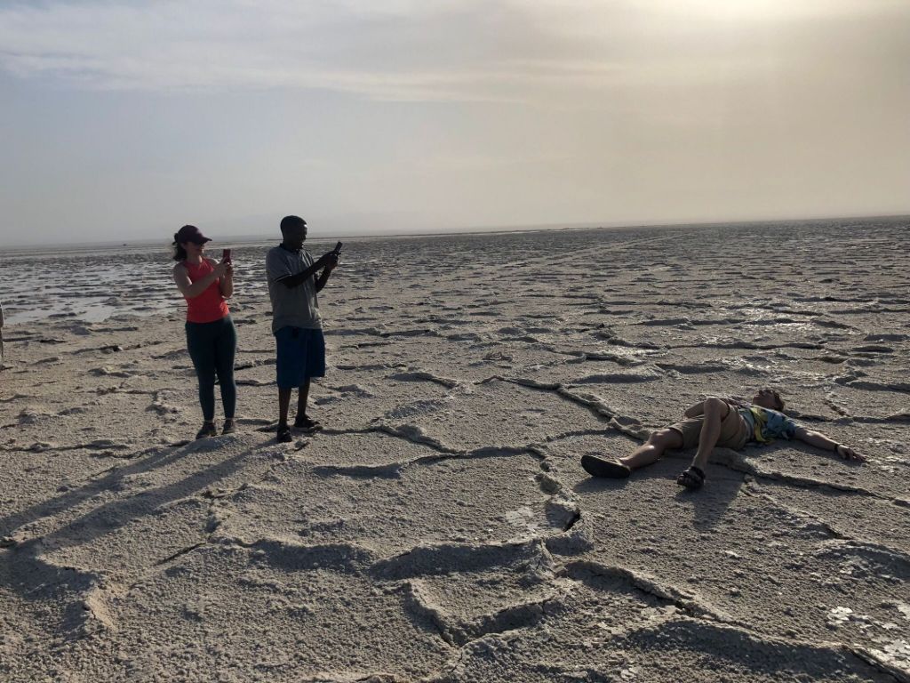 Arrivés au lac de sel, une séance photo s’impose alors que Tomi est en train de rendre l’âme. Heureusement, la chaleur commence à se dissiper et on trouve un peu d’eau salée pour se tremper les pieds en profitant d’un verre de rosé (notre guide pense à tout !). Même servi à température ambiante, ça requinque ! Les lacs de sel sont exploités par les locaux qui travaillent surtout la nuit pour éviter la forte chaleur de la journée. Les blocs de sel sont extraits manuellement : un travail de dur labeur, très physique, qui fait vivre les habitants de la région mais n’est malheureusement pas sans danger. Dernières photos avant de rentrer au village où notre dîner, préparé avec soin par notre chef Abdou, ainsi que notre campement, nous attendent. Ce soir, c’est dodo à la belle étoile dans le village de Ahmed Ela, sur des lits traditionnels et fabriqués artisanalement. Pour nos petits dos d’occidentaux, nous avons quand même droit à un matelas… Le confort est au rendez-vous 🙂