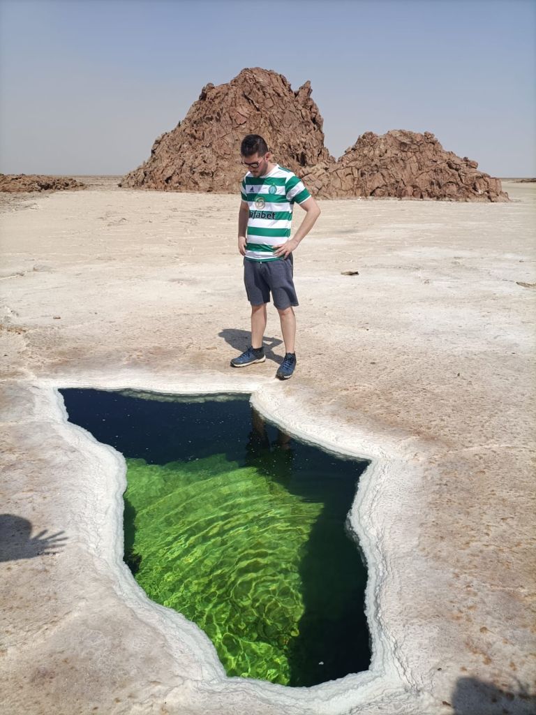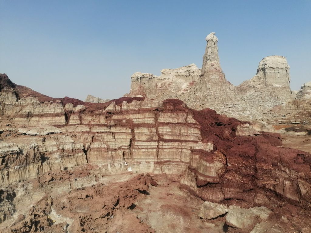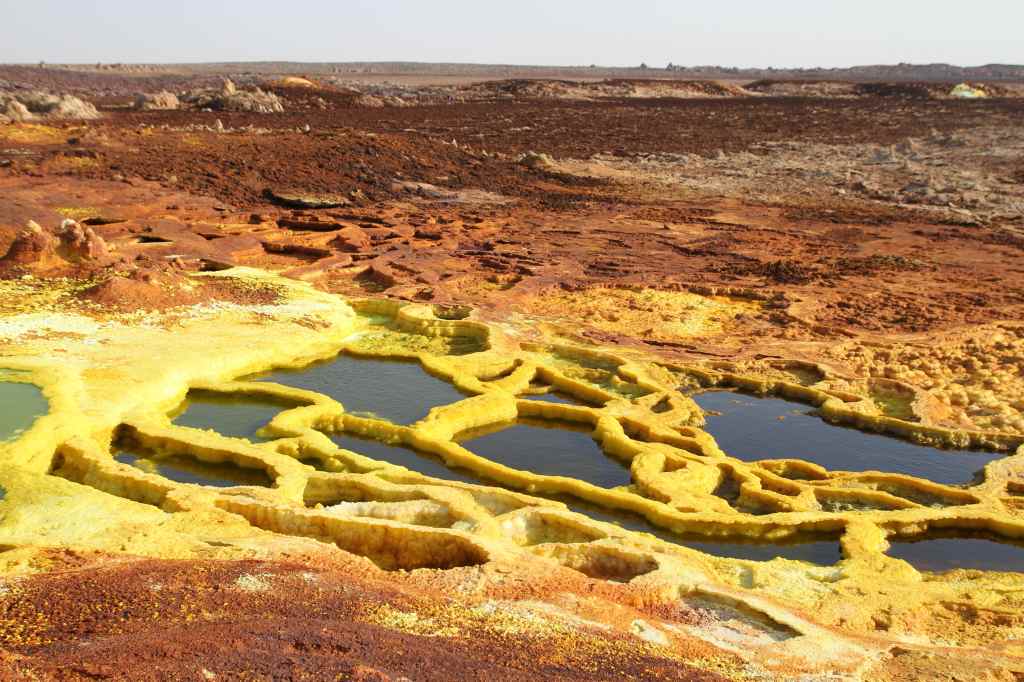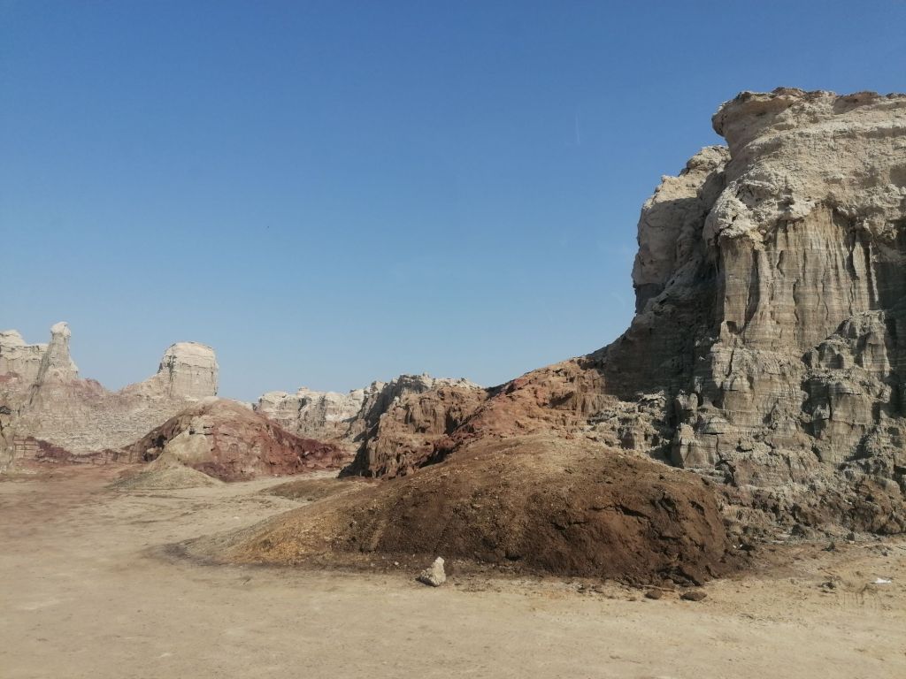 Après quelques photos en compagnie de ces concrétions rocheuses, on se rend à Dallol à 116m en dessous du niveau de la mer pour observer les paysages lunaires métamorphosés par le soufre. C’est l’un des endroits les plus bas de la planète et également l’un des lieux les plus chauds. Du bleu, du vert, du jaune… Pour le coup on en voit vraiment de toutes les couleurs ! Et malgré une odeur forcément peu ragoûtante, on s’imprègne de cet environnement unique en mutation constante puisque le soufre se déplace en fonction des conditions météorologiques.