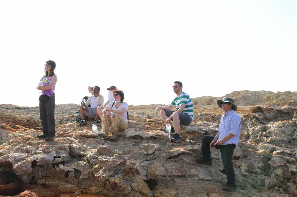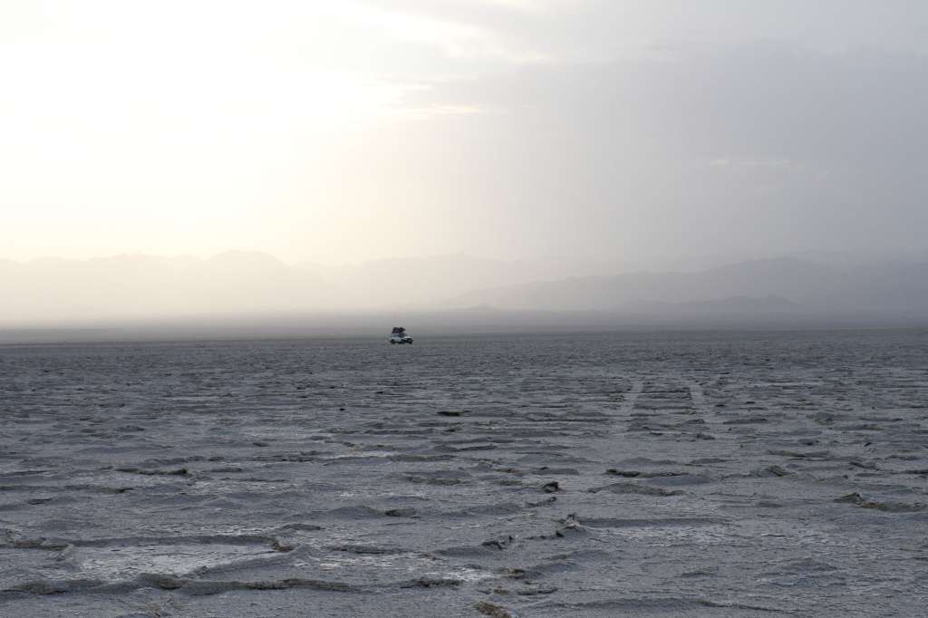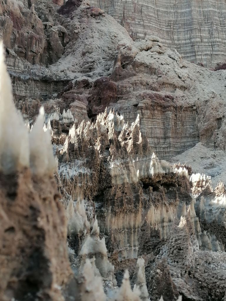 Après une nuit passée au son des camions énormes qui parcourent les routes de la région sans éclairage et sous un vent très chaud et sec, on se prépare à notre deuxième jour d’aventure. Réveil vers 6h (ou 0h locale), puis direction le Salt Canyon, digne de la planète Tatooine dans Star Wars. Il fait déjà très chaud et il faut ruser pour avoir de l’eau fraîche. C’est alors qu’on découvre la technique du « tissu mouillé enroulé autour d’une bouteille et mis le courant d’air » pour rafraîchir l’eau : c’est très efficace, et on se demande pourquoi ils n’ont pas fait ça avec le vin rosé la veille…