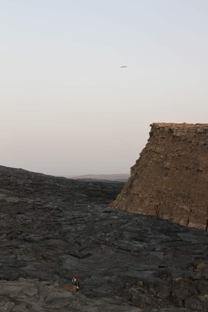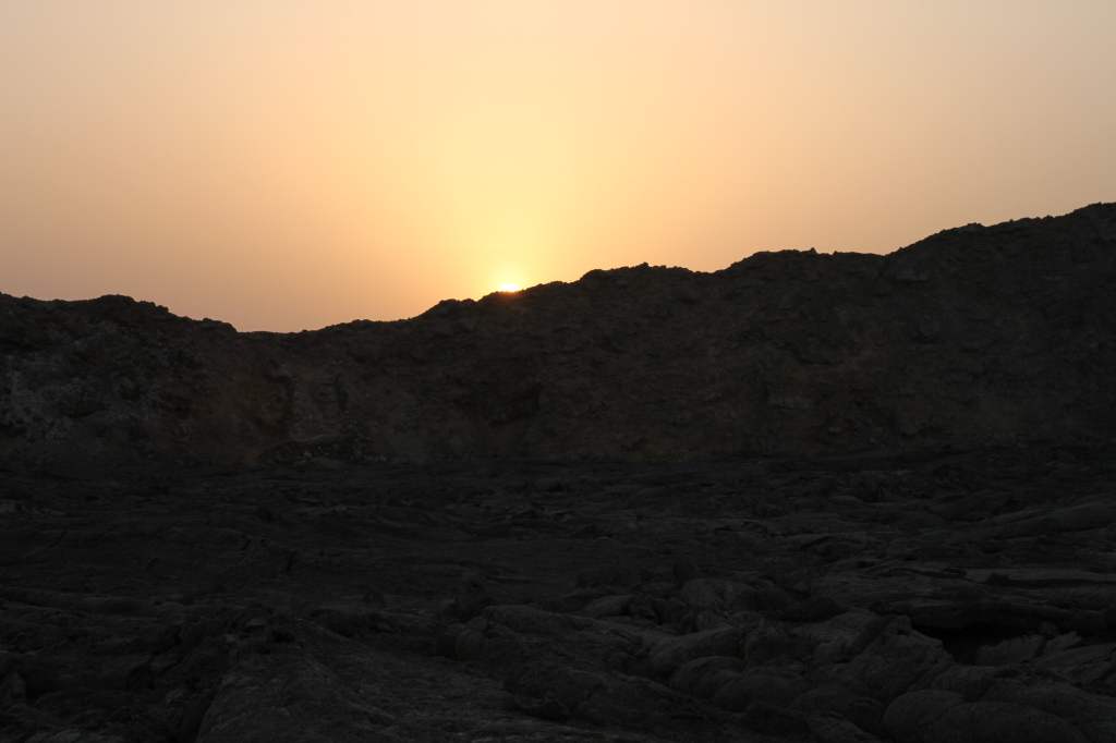 Mais, pas le temps de niaiser, notre journée d’aventures est loin d’être terminée et il est temps de se rendre au volcan Erta Ale, deuxième lieu phare de notre séjour dans la région Afar. Quelques heures de voiture plus tard, on se dégourdi les jambes avec joie. Une sorte de bourdonnement se fait entendre en continu alors que nous arrivons sur notre lieu de campement : c’est celui du volcan en éruption qui ne nous attend pas pour cracher son pesant de soufre et son pesant de lave ! Une vision incroyable qui nous subjugue, nous impressionne, autant qu’elle nous effraie alors que nous voyons la lave exploser à vitesse grand V à seulement quelques mètres de nous. L’odeur de soufre est très forte et nous sommes obligés de nous couvrir le visage dans certaines zones en fonction du vent. Le champ de lave séché sur lequel on se déplace date seulement de quelques semaines et est très fragile : après avoir failli perdre notre guide dans un trou, nous avons compris que si nous voulons survivre à cette journée il valait mieux que nous suivions le chemin marqué par quelques cailloux qu’un autre guide avait créé pour son groupe (des Français fans de volcans bien sûr…). Je reste personnellement quand même à distance car je trouverais ça vraiment bête de mourir à cause d’une goutte de lave qui me tombe sur la tête mais les autres, plus téméraires, s’approchent. Et, avec la nuit qui tombe, le spectacle devient de plus en plus dingue ! Honnêtement c’était assez lunaire de se trouver là, surtout avec cette concentration de Français venus tout spécialement en Éthiopie pour voir ce volcan !
