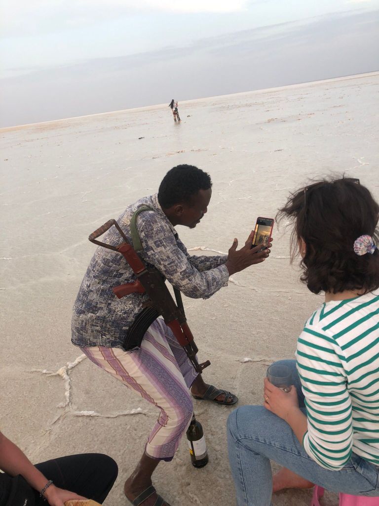 Après un petit déjeuner revigorant à Semera (dont un étonnant jus mangue/avocat super bon), c’est parti pour la première étape de notre excursion à la découverte des lacs de sel de la région Afar, notamment le lac Karoum. Et attention, en terme de route, ça ne rigole pas : comptez bien 7 heures de jeep sur une route plus ou moins construite (les Chinois sont apparemment partis avant de terminer leur œuvre au moment du Covid) donc, si comme Tomi vous êtes malade en voiture, accrochez vous les estomacs ! Sur la route nous découvrons des paysages arides, des cabanes construites par les peuples nomades qui habitent la région, quelques chameaux et des humains qui, on ne sait pas comment, survivent dans cet environnement où il fait 50 degrés à l’ombre (genre vraiment) et sans une goutte d’eau à l’horizon.