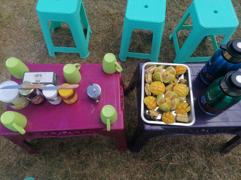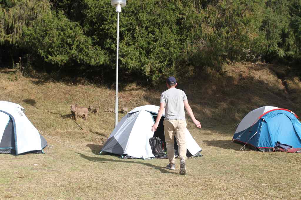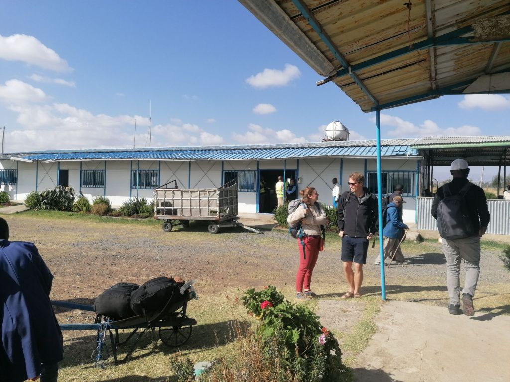 Déjà formés à un premier voyage en compagnie de Melese, nous étions prêts à affronter les conditions climatiques les plus extrêmes associées à un manque de confort digne des aventures les plus périlleuses. Cette fois, pas question de s’encombrer avec du matériel inutile tel que du savon ou même une serviette ! On se sentait très fiers de notre rapidité d’adaptation. Mais ça, c’était avant de découvrir notre camp pour les deux prochaines nuits : des magnifiques tentes quechua Black & fresh (toutes neuves car amenées par nos soins de France pour rendre service à Melese car il n’y a malheureusement pas de Décathlon en Éthiopie!), installées sur un charmant terrain ombragé à proximité d’une douche et de toilettes fonctionnels. Bon, et bien, tant pis pour la douche…